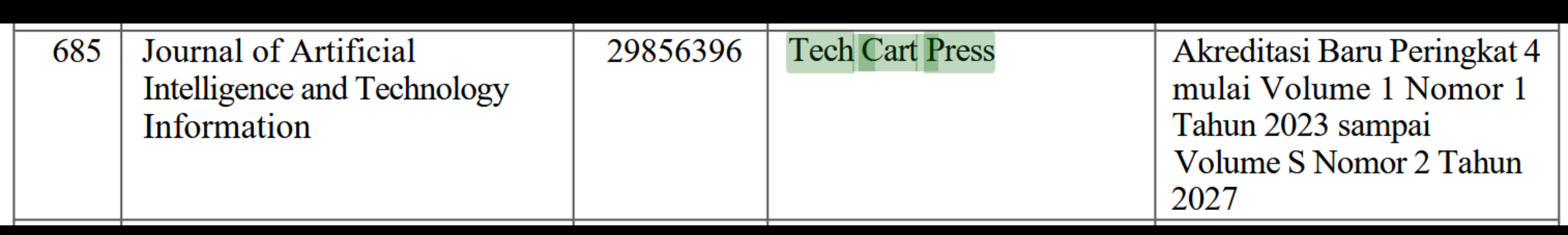 Journal of Artificial Intelligence and Technology Information (JAITI) is a peer-review journal focusing on Artificial Intelligence and Technology Information issues. Journal of Artificial Intelligence and Technology Information (JAITI) invites academics and researchers who do original research in artificial intelligence and technology 1nfromation.Journal of Artificial Intelligence and Technology Information (JAITI) is published by Tech Cart Press in March, June, September, and December every year. Journal of Artificial Intelligence and Technology Information (JAITI) accept articles in Bahasa Indonesia and English.